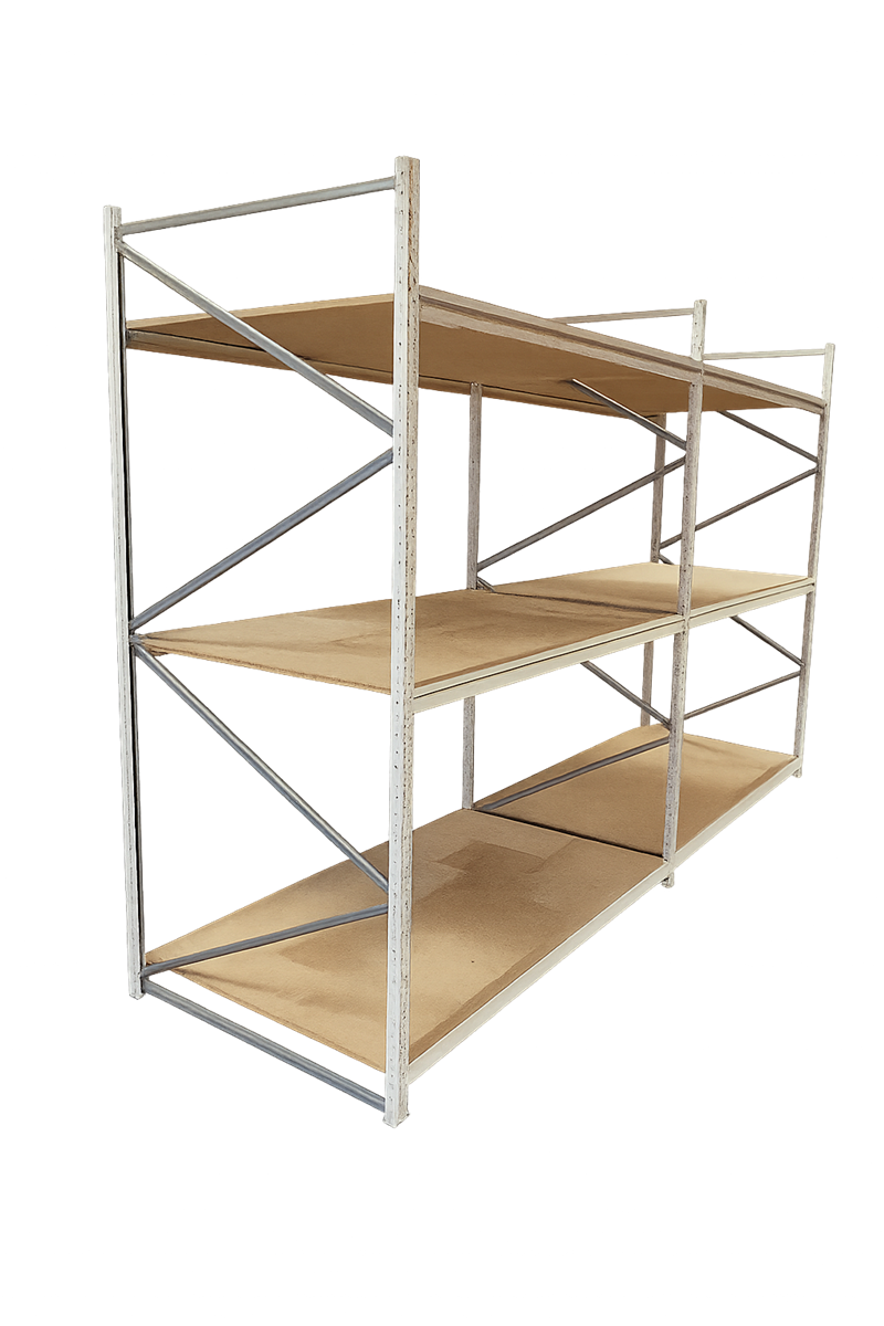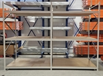 Brugt 2 fags storfagsreol, komplet med 3 stigegavle, 12 bærebjælker og 6 spånhylder.