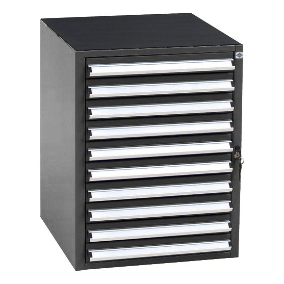Skuffeskab SS 1.10 med letløbende skuffer, lejret i skinner med stålkugler og med 100% udtræk. Skufferne er udstyret med skuffespærre. Toppen er som standard udstyret med en riflet gummimåtte. Skabet har i alt 10 skuffer på hver 66 mm. i højden.