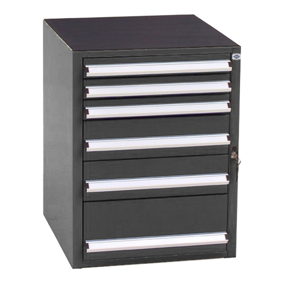 Skuffeskab SS 1.6A med letløbende skuffer, lejret i skinner med stålkugler og med 100% udtræk. Skufferne er udstyret med skuffespærre. Toppen er som standard udstyret med en riflet gummimåtte. Skabet har i alt 6 skuffer - 1 stk. på 198 mm., 2 stk. på 132 mm. og 3 stk. på 66 mm. i højden.