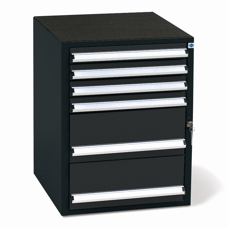 Skuffeskab SS 1.6C med letløbende skuffer, lejret i skinner med stålkugler og med 100% udtræk. Skufferne er udstyret med skuffespærre. Toppen er som standard udstyret med en riflet gummimåtte. Skabet har i alt 6 skuffer - 2 stk. på 198 mm. og 4 stk. på 66 mm. i højden.