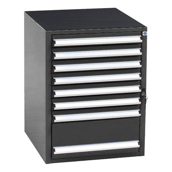 Skuffeskab SS 1.8A med letløbende skuffer, lejret i skinner med stålkugler og med 100% udtræk. Skufferne er udstyret med skuffespærre. Toppen er som standard udstyret med en riflet gummimåtte. Skabet har i alt 8 skuffer - 1 stk. på 198 mm. og 7 stk. på 66 mm. i højden.
