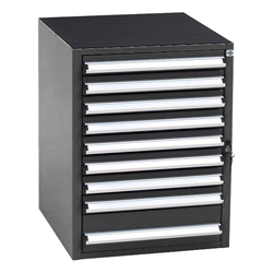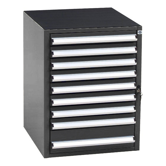 Skuffeskab SS 1.9 med letløbende skuffer, lejret i skinner med stålkugler og med 100% udtræk. Skufferne er udstyret med skuffespærre. Toppen er som standard udstyret med en riflet gummimåtte. Skabet har i alt 9 skuffer - 1 stk. på 132 mm. og 8 stk. på 66 mm. i højden.
