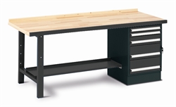 2500 mm langt værkstedbord med solid 48 mm bordplade i bøgeparket. Komplet med stålforkant, hylde og SS-1.5A skuffesektion. Skuffesektion kan monteres i højre eller venstre side. Benene er forberedt til fastboltning i gulv.