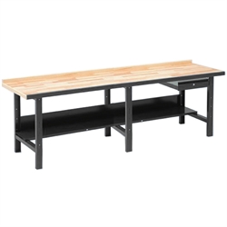 3000 mm langt værkstedbord med solid 48 mm bordplade i bøgeparket. Komplet med stålforkant, bagstiver, underhylde og enkelt skuffe. Benene er forberedt til fastboltning i gulv.