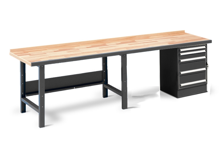 3000 mm langt værkstedbord med solid 48 mm bordplade i bøgeparket. Komplet med stålforkant, vange og SS-1.5A skuffesektion. Skuffesektion kan monteres i højre eller venstre side. Benene er forberedt til fastboltning i gulv.