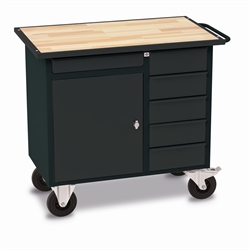 Værkstedsvogn VV-2 med bøgeparket bordplade og hjul (2 faste og 2 drejelige med bremse). Leveres med 5 smalle og 1 bred skuffe samt skabssektion med 1 flytbar, galvaniseret hylde.
