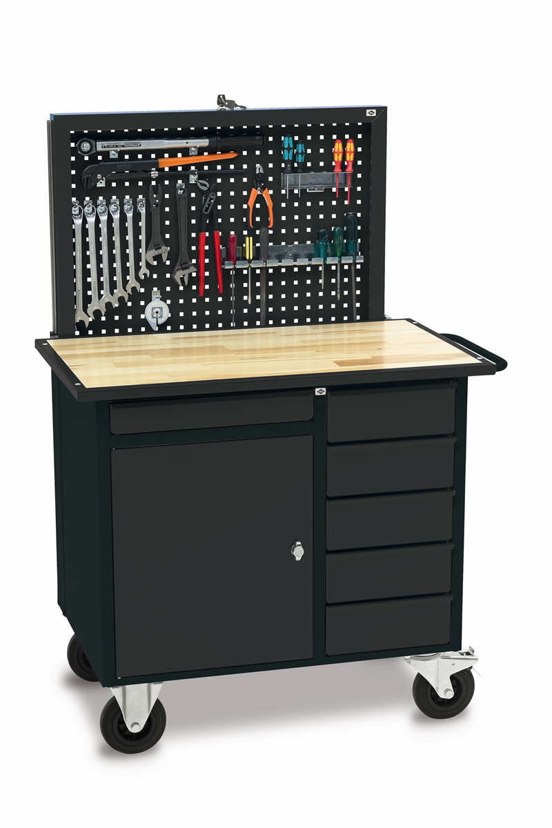 Komplet værkstedvogn som grundmodellen. Elevatortavlen med automatisk hævefunktion kan nedsænkes og aflåses i niveau med bordpladen.