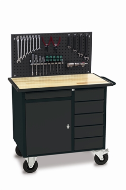 Værkstedsvogn VV-2 med bøgeparket bordplade og hjul (2 faste og 2 drejelige med bremse). Leveres med 5 smalle og 1 bred skuffe samt skabssektion med 1 flytbar galvaniseret hylde, samt værktøjstavle, monteringsbeslag til værktøjstavle og krogsæt OS96.