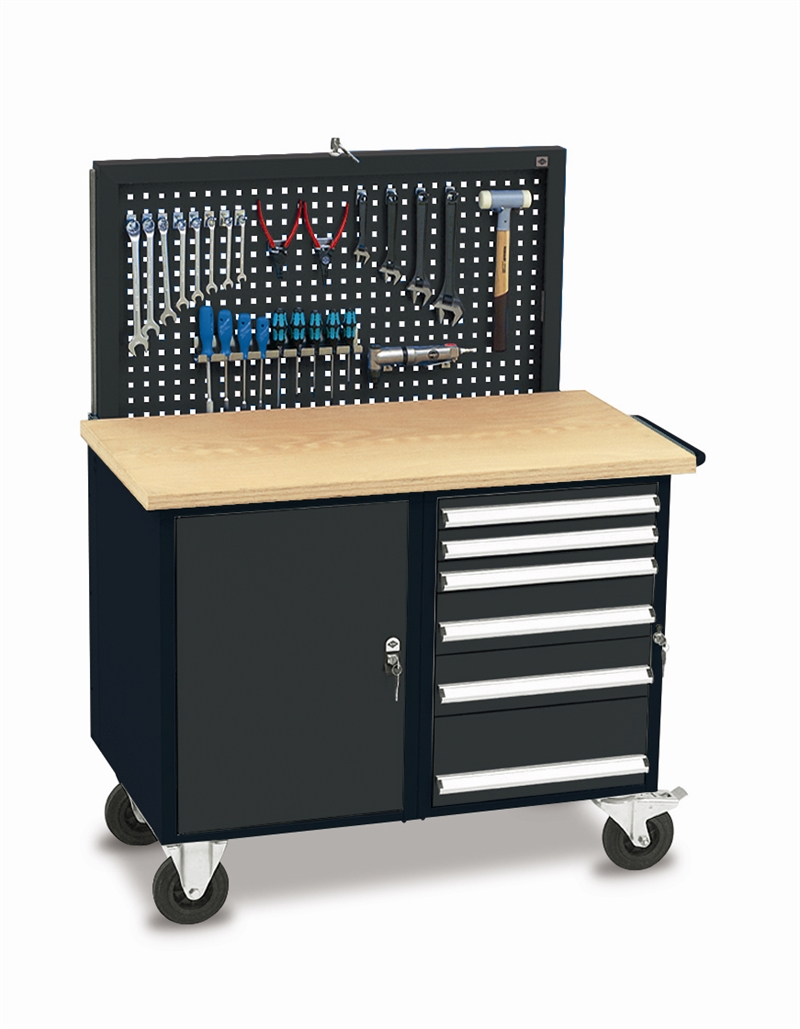 Værkstedsvogn VVM-1.2 med 2 faste hjul og 2 drejelige med bremse. Monteret med værktøjsskab med 1 galvaniseret hylde i venstre side og skuffeskab med 6 skuffer i højre side. Multiplex bordplade med håndtag. Desuden aflåselig værktøjstavle (elevatortavle) formonteret.